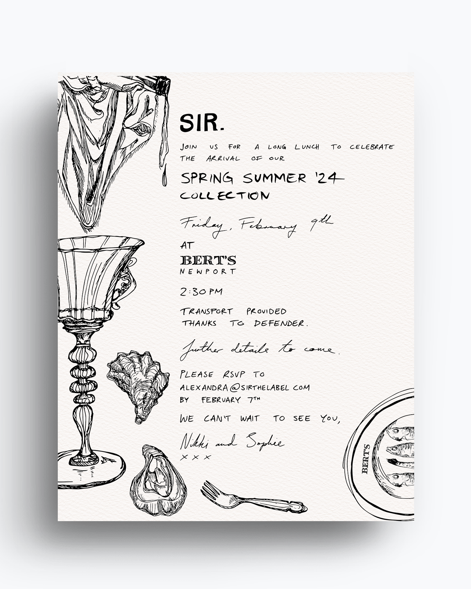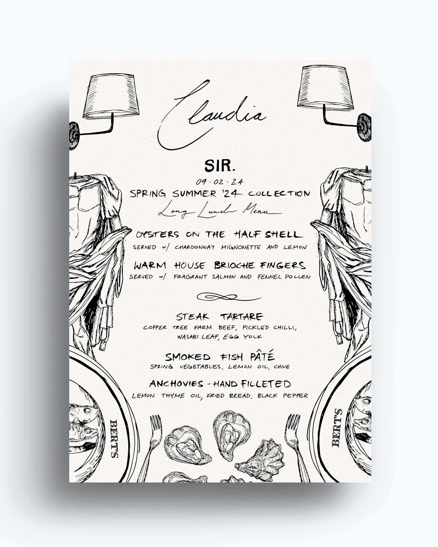 Adored collaborating with the heavenly girls of iconic contemporary Australian designer ‘Sir The Label’ to design invite and menus for a long lunch at Bert’s Newport, celebrating the launch of their divine Spring Summer ‘24 collection. The art was inspired by an opulent Sicilian Palazzo which created the decadent moodboard for their collection and illustrations channeled the perpetual elegance, effortless cool and playfulness of the Sir girl.